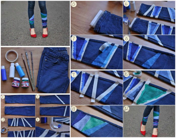 Простой геометрический рисунок внизу штанин поможет здорово освежить внешний вид старых джинсов. Для этого понадобится несколько оттенков специальных красок для ткани, кисточки и малярный скотч.