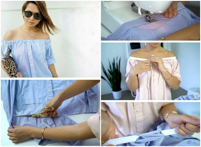Если в вашем гардеробе завалялась рубашка, фасон которой уже мягко говоря устарел, смело берите ножницы и приступайте к ее модной трансформации. Для этого нужно отмерять и аккуратно отрезать воротниковую часть и верхнюю часть рукавов, а после вшить резинку — получится стильная туника с открытыми плечами. Конечно, для осуществления подобной переделки потребуются навыки шитья. В случае отсутствия таковых, просто отнесите рубашку в ателье.