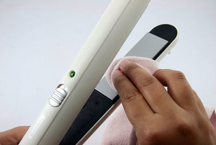 Очистить утюжок для выпрямления волос можно с помощью спирта или теплой воды и махрового полотенца. Для этого, плойку нужно немного нагреть и бережно протереть керамические пластины полотенцем, смоченным в спирте или теплой воде. Такую чистку лучше проводить после каждого использования утюжка, чтобы стайлинговые средства с волос не оседали на ее поверхности и не портили нагревательные пластины.