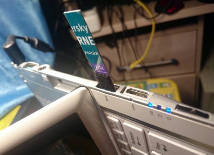 Почистить usb-порты компьютера или ноутбука можно с помощью картонной пластинки, шириной чуть уже самого разъема, с приклеенной к одному концу липучкой.