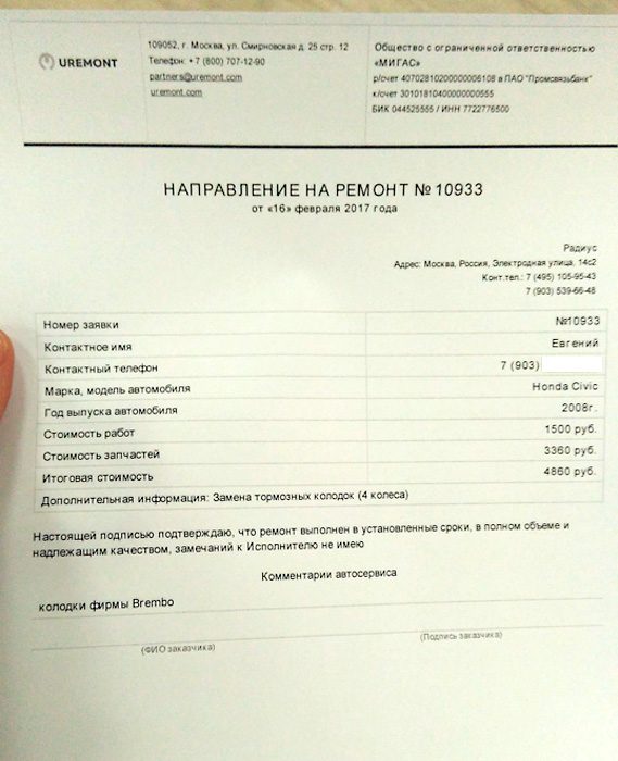 Волнующий момент — оплата работы. И тут вроде все, как договаривались. Сел в машину, на пустой дороге 2-3 раза проверил тормоза — не свистят, схватывают как надо. Понятно, что время покажет, но пока никакого подвоха. Из минусов могу придумать только то, что обещанных скидок я так и не увидел, хотя с другой стороны, при такой цене, какие могут быть еще скидки?