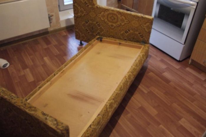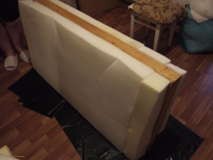 Ну вот, деревяшка в отличном состоянии. Далее, по ранее разработанному плану: ткань, поролон, синтепон, степлер, скобы, молоток.