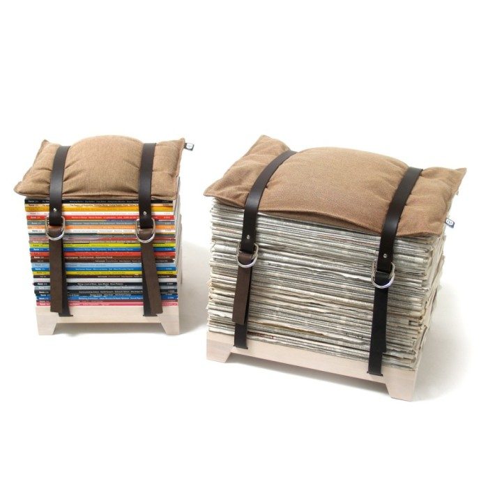 Старые журналы или книги, которые годами пылятся в шкафу, могут оказаться полезными при создании креативной мебели. Скрепите стопку прессы при помощи кожаного ремня, а сверху положите мягкую подушку.