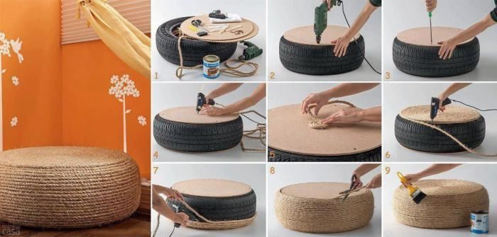 Для изготовления такого необычного пуфа, который также может выступать в качестве журнального столика, лучше использовать неповрежденную шину. При помощи клея «жидкие гвозди» ее необходимо задекорировать толстым шнуром. Не забудьте тщательно очистить шину от пыли и грязи, иначе веревочный декор на ней не будет долго держаться.