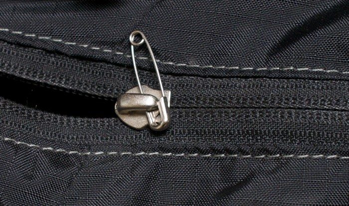 Чтобы никто не смог незаметно открыть вашу сумку и стащить её содержимое, булавкой соедините «собачку» и ремешок сумки/лямку рюкзака. Теперь, чтобы заглянуть вовнутрь, понадобится время. И сделать это без вашего внимания точно не получится.