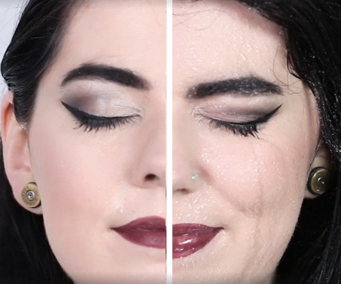Всё предельно просто: ингредиенты тщательно смешайте друг с другом и залейте в контейнер с распылителем. После того, как завершите макияж, распылите немного средства на расстоянии 20-30 см от лица. Сочетание алоэ и гамамелиса не только поможет закрепить косметику, но при этом увлажнит кожу, а лаванда успокоит раздражение. Увлажнённое лицо не будет вырабатывать излишек себума, соответственно макияж не будет «плыть». Просто и эффективно. А фото «до» и «после» будут ещё красноречивее. Слева – макияж после закрепителя и брызгов воды, справа – без закрепителя после той же водной процедуры.