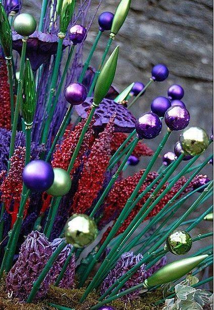 Елочные игрушки, надетые на окрашенный в зеленый цвет палочки, станут необычным садовым декором. Палочки втыкаются в клумбы или просто в любых местах сада.