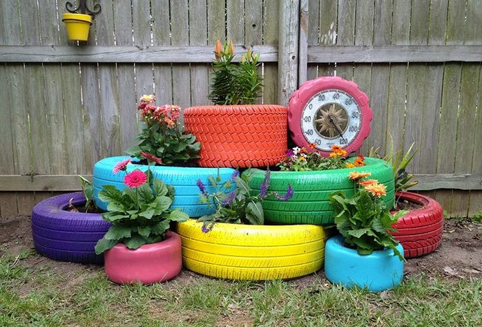 Из старых шин можно соорудить необычную клумбу. Для того чтобы она выглядела интереснее, окрасьте шины в яркие цвета.