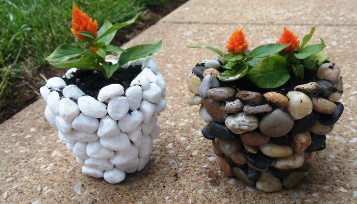 Обычные горшки для растений становятся оригинальным садовым декором. Речная или морская галька приклеивается к ним при помощи клея «жидкие гвозди».