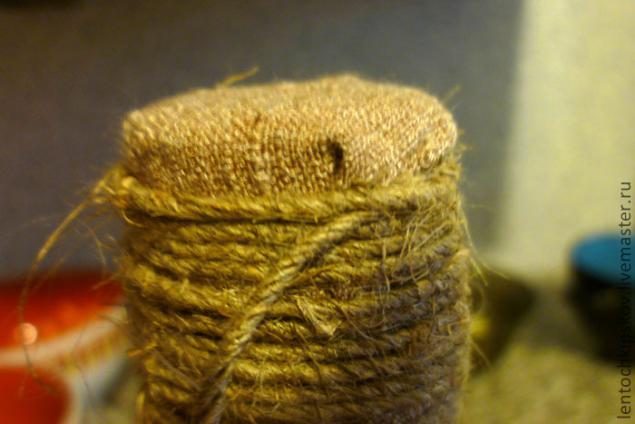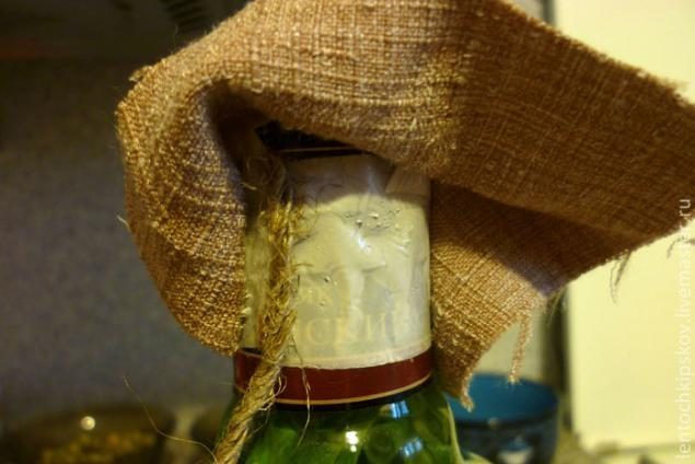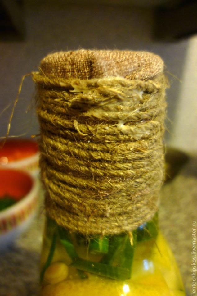 10. Обвиваем бечевкой горлышко бутылки начиная снизу. Стараемся делать это плотненько, без просветов.