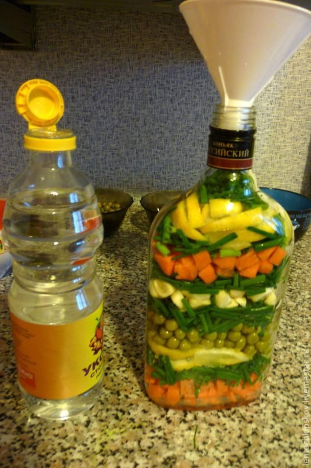 7. Когда уложены все продукты, заливаем их уксусом через воронку. Заливаем по чуть чуть, можно немного стукнуть бутылочкой по столу, чтобы овощи уложились и уксус больше разлился внутри. Дать бутылочке постоять минут 5. Уксус немного опустится, впитается в овощи и долить еще раз, до конца.