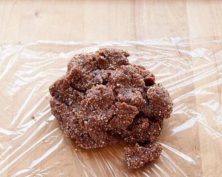 И сформируйте прямоугольный пласт. Мы придаем форму нашему «тесту» для того, чтобы потом аккуратно порезать его на одинаковые батончики. Заверните пленку и поместите «тесто» в холодильник минимум на час, а лучше — на ночь.