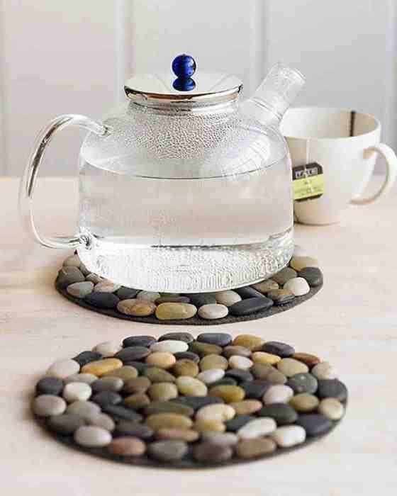 Надоевшая подставка под горячее может быть преображена при помощи наклеенной на нее гальки. Рекомендуем использовать камешки одинакового размера — так чайник будет максимально устойчивым.