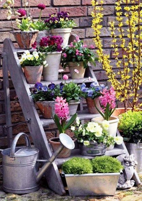 Ненужную деревянную стремянку можно превратить в изумительную полку и использовать ее для хранения контейнеров с рассадой, цветов в горшочках, леек и мелкого ручного инструмента.