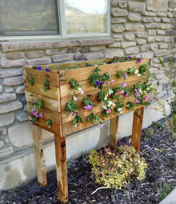 Деревянный ящик с отверстиями, которые позволят цветам красиво ниспадать каскадом, прекрасно подойдет для выращивания петуний и в скором времени станет настоящей изюминкой ландшафта.