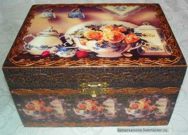 Это прекрасный способ самую банальную вещь превратить в произведение искусства. Сейчас используется для создания сувениров, отделки и реставрации различных предметов домашнего обихода, от мебели до бытовой техники. Часто сочетается с патиной и кракелюром – техниками состаривания новых вещей.