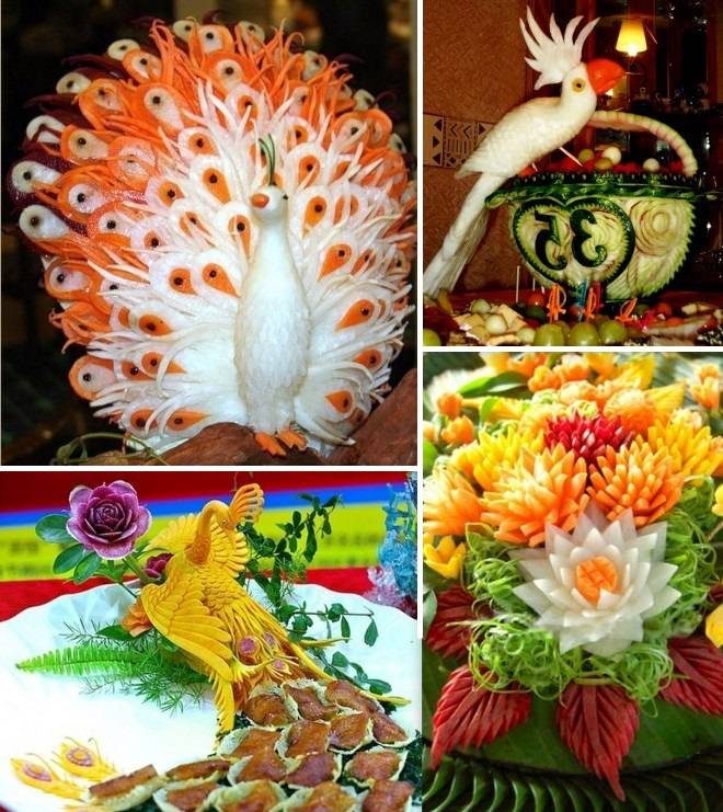 Данное слово переводится, как резьба, причем все равно по чему – дереву, камню или кости. Но сейчас так называют именно резьбу по фруктам, в общем-то, очень древнее восточное ремесло, которое совсем недавно вошло в моду в Европе.