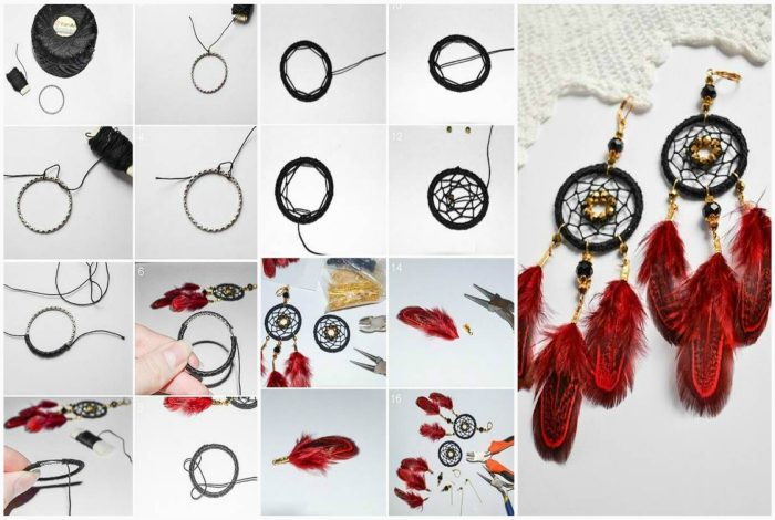 Простые в исполнении, но при этом красивые и воздушные серьги-талисманы, которые можно сделать самостоятельно из специальной фурнитуры, небольших колец, проволоки, ниток и перьев.