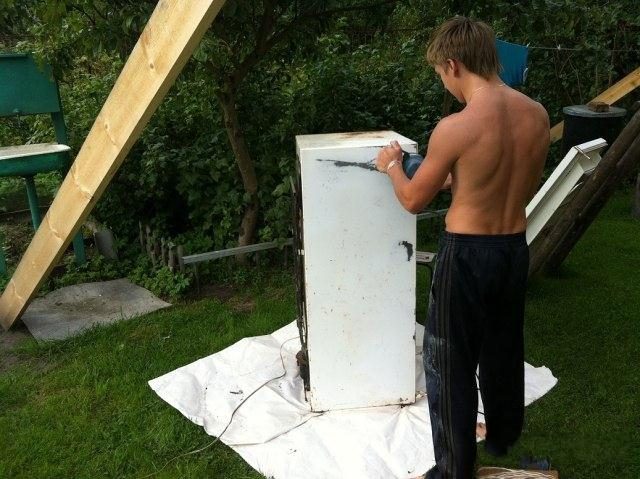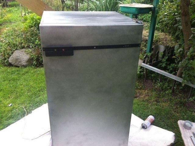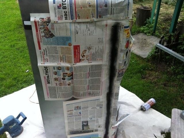 Покопавшись в гараже, нашел 2 баллончика краски и полбаллончика грунта. Закипела работа. Мысль сфотографировать весь процес родилась на сразу, поэтому к моменту начала съемки я уже успел снять два слоя краски (дед два раза красил холодильник кистью).