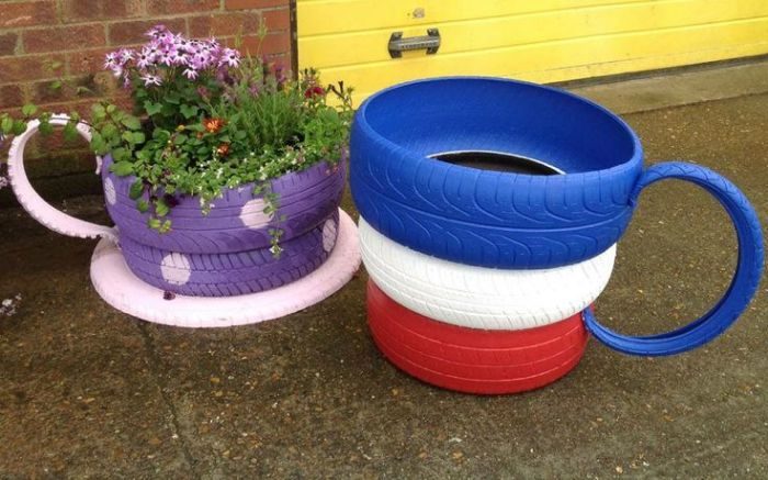 Еще один эффектный вариант клумбы из автомобильных покрышек — это большие чашки, разукрашенные в яркие цвета. Можно не сомневаться, что такие цветники вызовут восторг гостей.