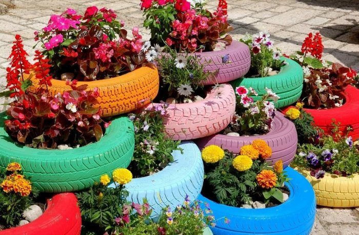 Цветник из разрезанных на части шин выглядит ничем не хуже настоящего. А самое главное — что такая клумба будет радовать неизменным внешним видом на протяжении всего года.
