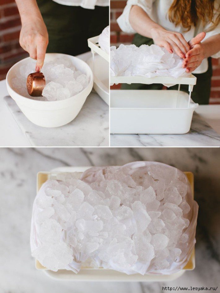 Теперь сверху на влажную бельевую композицию выложите кубики льда. Они должны покрывать всю поверхность.