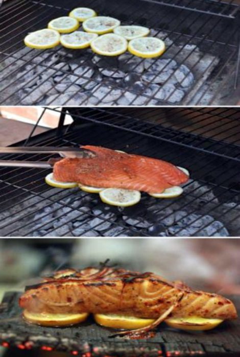 Чтобы рыба не прилипла к решетке гриля, приобрела пикантный вкус и невероятный аромат, готовьте ее на лимонной «подушке». Для этого, лимон нужно нарезать кружочками средней толщины, выложить их на решетку для гриля, а сверху положить кусочек рыбы и приступать к готовке.