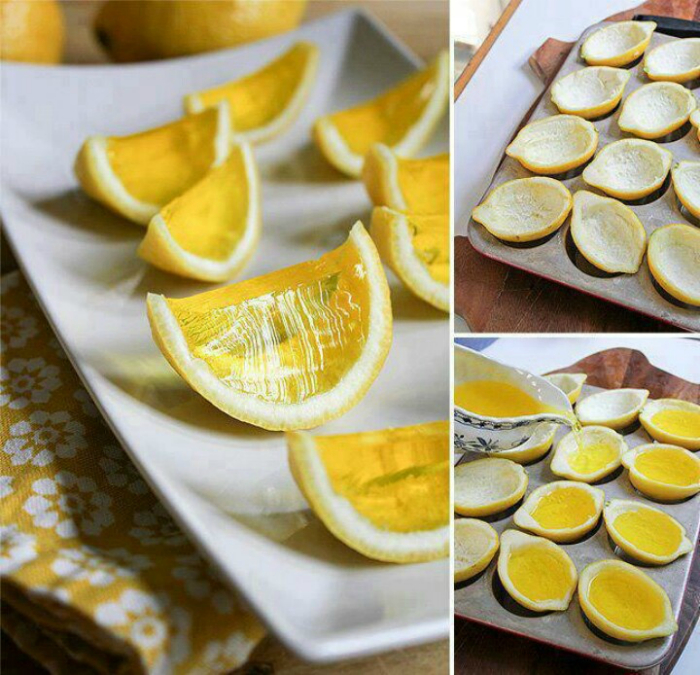 Лимонные корки, оставшиеся после выжимания сока, можно использовать для приготовления оригинального желе в виде долек лимона. Для этого половинки лимона с помощью ложки нужно тщательно очистить от мякоти, залить в зачищенную кожуру желе и поставить застывать в холодильник. Заключительный этап – разрезание половинок на дольки.