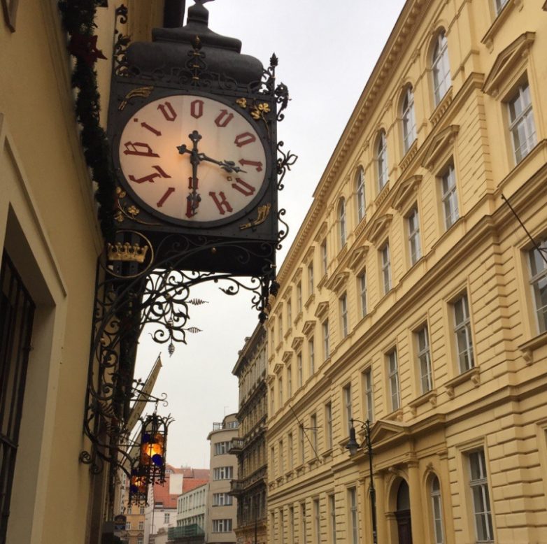 Фирменные часы над самой старой пивной Праги. Цены в U Fleků выше, чем в других пивных, но хотя бы раз попробовать единственное предложенное в меню тёмное пиво, которое варят там неизменно с XVI века, стоит.