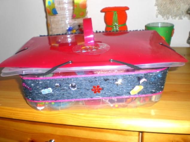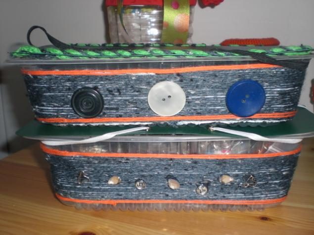 При желании коробки для мелочей можно сделать с крышками. Для этих целей я взяла старые пластиковые папки, вырезала под размер коробки и, проделав дыроколом или горячей спицей дырки, прошила их вместе с краем платиковой коробки. Так как у меня на фотографии двухярусная пластиковая коробка, для удобства я сделала из обрезков папки ручку, которую тоже приклеила горячим клеем к днищу второго яруса.