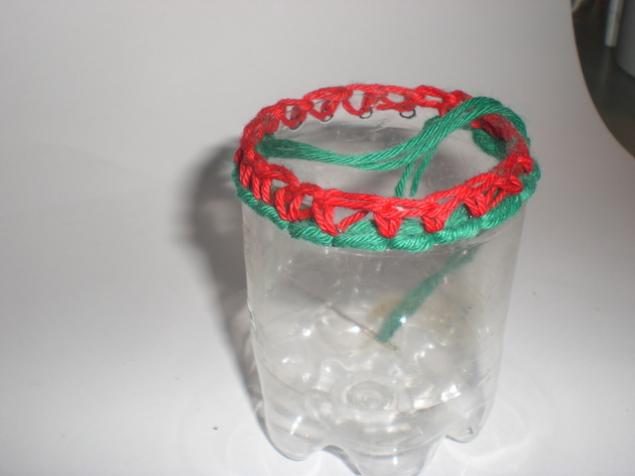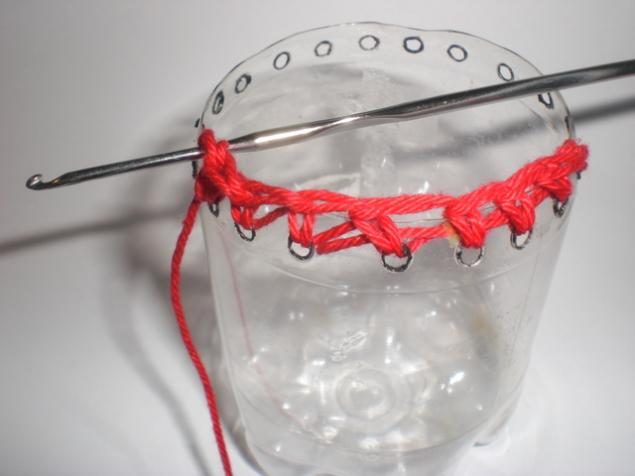 Накаливаем стальную спицу и проделываем отверстия по краю бутылки, которые должны будут подходить под размер крючка, которым мы будем обвязывать края бутылки.