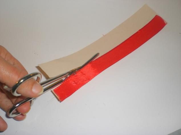 Отрезаем ленту необходимой длины и приклеиваем ее на двухсторонний скотч. Излишки скотча обрезаем.