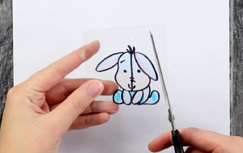 С помощью дырокола сделай небольшое отверстие над рисунком и вырежь по контуру пластиковую фигурку.