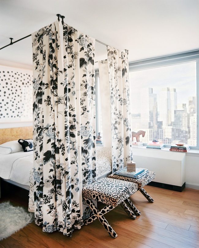 Если повесить карниз для шторы над кроватью, то комната не кажется банальной.