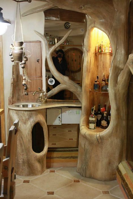 Потрясающий мини-бар и тумба под мойку на кухню, сделанные из пней, станут неповторимыми деталями любой кухни.