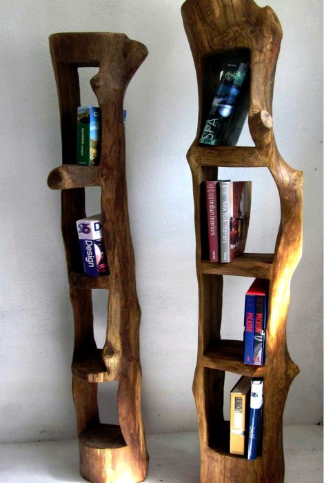 Стильные узкие стеллажи для книг и предметов декора, из деревянных срубов, замечательно дополнят любой современный интерьер и привнесут в помещение нотки тепла и уюта.