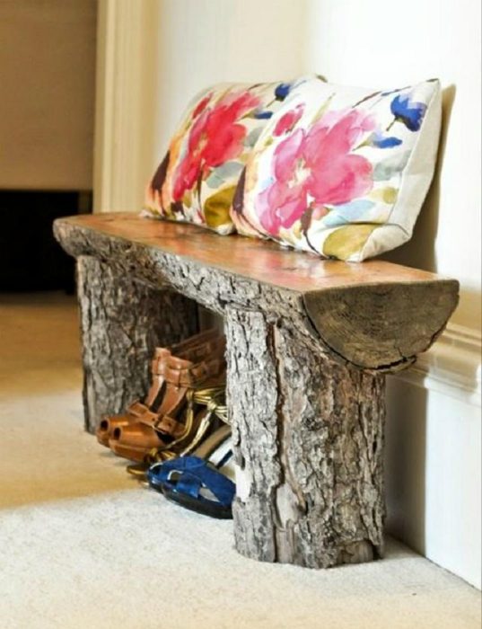 Чудесная небольшая скамья, сделанная из нескольких деревянных срубов и украшенная декоративными подушками, станет необычной деталью интерьера современной городской прихожей.