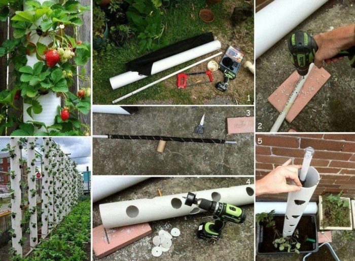 Нередко случается, что клубника, выращиваемая обычным способом — на грядке, созревает неравномерно и даже может загнить. Ведь на одну ее сторону солнце может не попадать вообще, так как часто плоды лежат на земле или находятся под листиками. Решить проблему поможет вертикальная грядка из отрезка пластиковой трубы большого диаметра. Клубника как вьющееся растение обязательно найдет путь наружу — через отверстия в пластике.