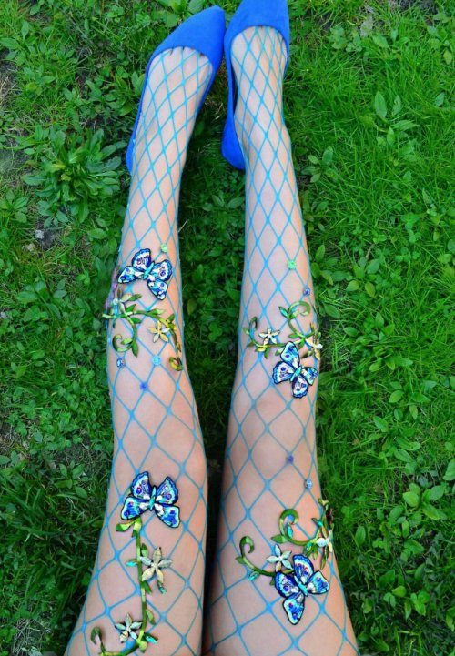 В качестве основы она использует колготки в сетку и украшает их стеклянными камнями, бусами и искусственными цветами, превращая в предмет одежды, подходящий для современной принцессы.