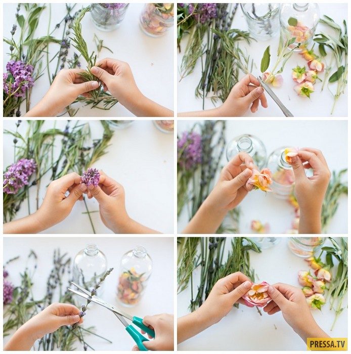 Выбирайте «купаж» для вашей ароматной композиции. Автор инструкции предлагает беспроигрышный весенний микс: цветы сирени, лепестки роз, подсушенные соцветия лаванды и розмарин. Хотя вы можете подобрать другой букет под настроение. Или предложить выбор ребёнку, которому наверняка понравится этот маленький проект.