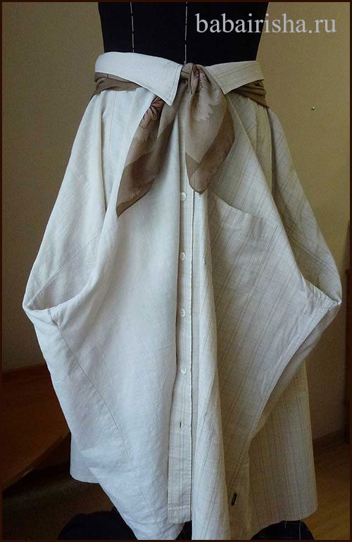 Эта юбка меня очаровала сразу! Она подходит моей, хоть и располневшей, но не бедрастой фигуре, по стилю и оригинальности эта юбка может поспорить с дизайнерской, а по простоте пошива не имеет себе равных.Если прибавить к этому, что сшить её можно из двух завалявшихся мужских рубашек, то и цены ей нет в буквальном смысле этого слова!