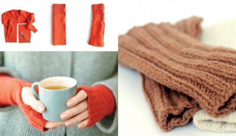 Не стоит тратить время на вязание или деньги на покупку варежек, которые будут прятать руки от первого мороза. Вы запросто сможете их сделать все из того же нашего старого друга. А на замену рукавичкам отлично подойдут модные митенки без пальчиков, сделанные из рукавов старого джемпера.