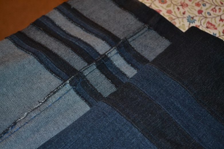 Берем джинсы, отрезаем линию шва (не вижу смысла распарывать, там почти всегда другой цвет или заломы), и отрезаем полосу нужной Вам ширины. Вариации ширины полос могут быть на вкус и цвет, а также в зависимости от того, насколько необходимо удлинить изделие. Синие джинсы я удлиняла на 12 см, черные на 8.