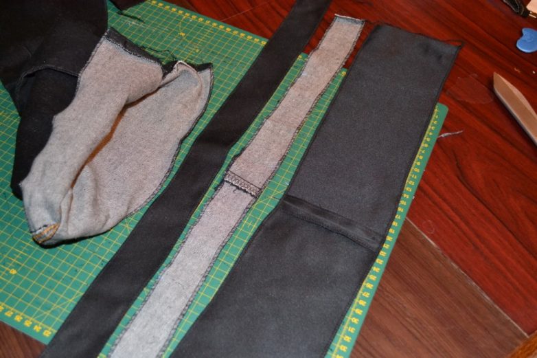 Начинаем собирать удлиненную штанину с отступом 1 см ну или просто чуть шире ширины лапки. (ВНИМАНИЕ! Ширина штанин переда и зада отличается и можно собрать неправильно! Лучше поставить метки для себя верх-низ, левая-правая.)