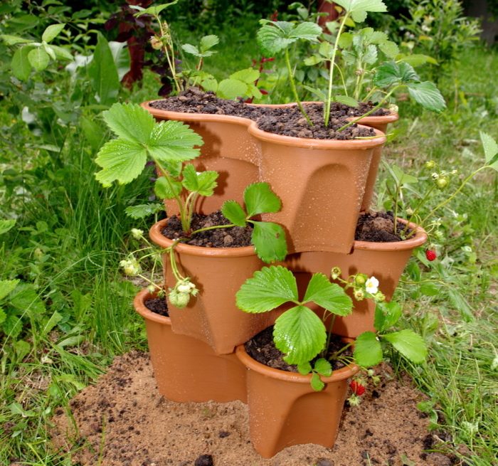Из множества пластиковых цветочных горшков легко сделать оригинальную вертикальную грядку. Чтобы конструкция была устойчивой, скрепите горшки между собой шурупами. Достойно выглядит конструкция, где нижний ярус составлен из горшков максимального диаметра, а верхний — минимального.