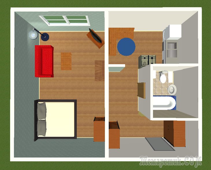 Небольшая квартира разделена на две зоны: жилую и общественную. Из небольшой прихожей ведут три двери: в совмещенный санузел, на кухню и в комнату, где оборудовали спальное место с двуспальной кроватью и мягкую зону.