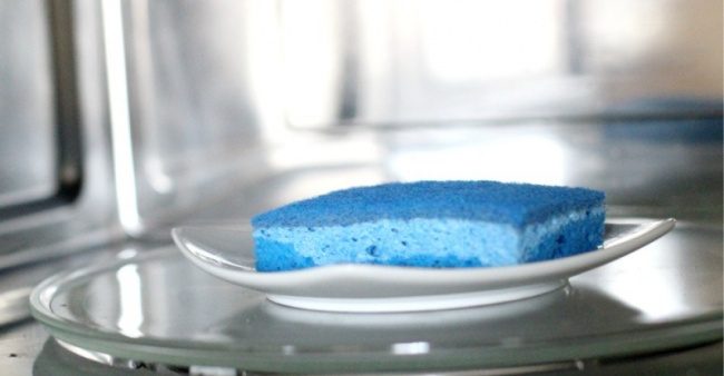 На обильно смоченную в воде губку выдавите немного моющего средства и хорошенько вспеньте его. Положите губку в микроволновку и включите ее на минимальную мощность на 30 секунд. Откройте дверцу и протрите микроволновку изнутри той же губкой. Этот способ не только облегчит чистку микроволновки, но и удалит неприятный запах и микробы с губки.