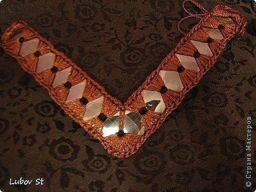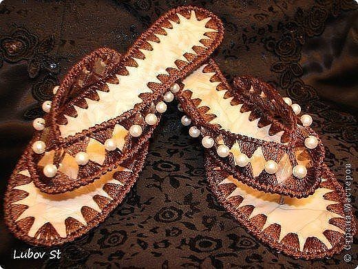 Дыроколом прокалываем дырочки посередине полосок и закругляем ножницами уголочки. Подошву обвязываем, предварительно проколов дырочки дыроколом. Так же обвязываем полосочки, при этом соединив их вместе под углом 90 гр. Соединяем обе детали вместе, обвязав всю подошву вместе с полосочками рачьим шагом. Приступаем к изготовлению «держателя» верхней и нижней деталей тапочек. Для этого я продела через бусину ниточку, из неё связала цепочку из воздушных петель и продела её сквозь кусочек от капельницы. Можно оставить просто цепочку из воздушных петель, а можно и нанизать бисер. Но надо посмотреть чтобы между пальчиками не было больно. В подошве, между первым и вторым пальчиками протыкаем дырочку шилом и закрепляем наш «держатель». я закрепила вот таким способом: связала с обеими сторонами и еще промазала клеем. Самый приятный и в тоже время самый мучительный этап — украшение. Я украсила просто бусинами. С изнаночной стороны я приклеила подошвы от старых шлепок из расчета, что буду их носить летом на улице. Желаю вашим ножкам уюта и комфорта!