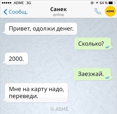 Ситуация 6. Вам приходит сообщение в соцсети от друга с просьбой занять денег, переведя их на карту.