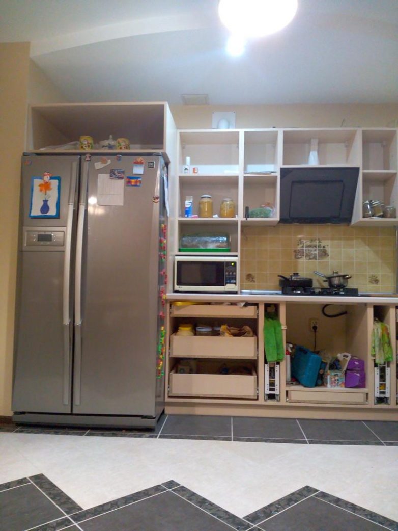 Вот наконец то шаг за шагом я собрала все шкафы и с мужем начали собирать всё воедино… Вот так выглядело всё первое время пока не было денег на фасады.